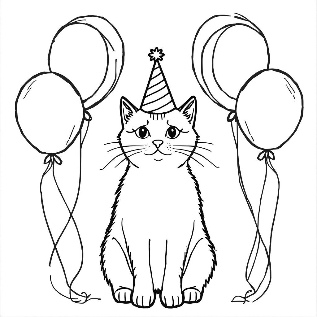 In the drawing “Cat and Party Coloring Pages”, we see an adorable cat wearing a party hat, surrounded by colorful balloons that float happily around him. The scene captures the essence of a birthday celebration, where the cat appears to be having a great time. For coloring, you can use vibrant tones for the balloons, such as red, blue and yellow, while the cat can be painted with your favorite colors, such as orange or gray, with white details on the belly and paws.