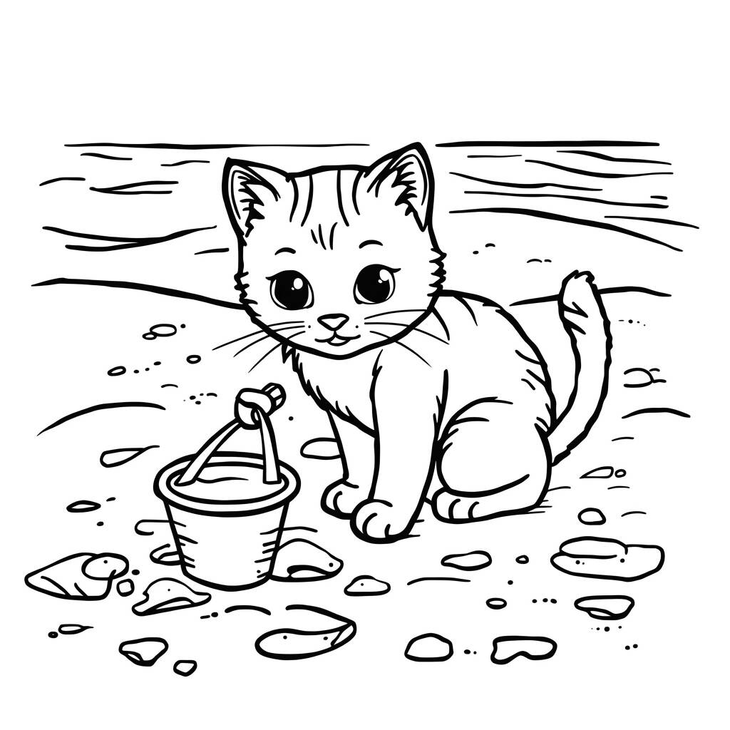 In the cat and beach coloring page, imagine an adorable cat playing in the warm sand under the bright sun. He's equipped with a bucket and shovel, ready to build the sandcastle of your dreams. The cat's eyes are full of curiosity and joy as he explores every grain of sand, making little mountains and holes, while the sea waves gently break in the background. The setting is perfect for stimulating the imagination and creativity of those who are going Coloring Page.
