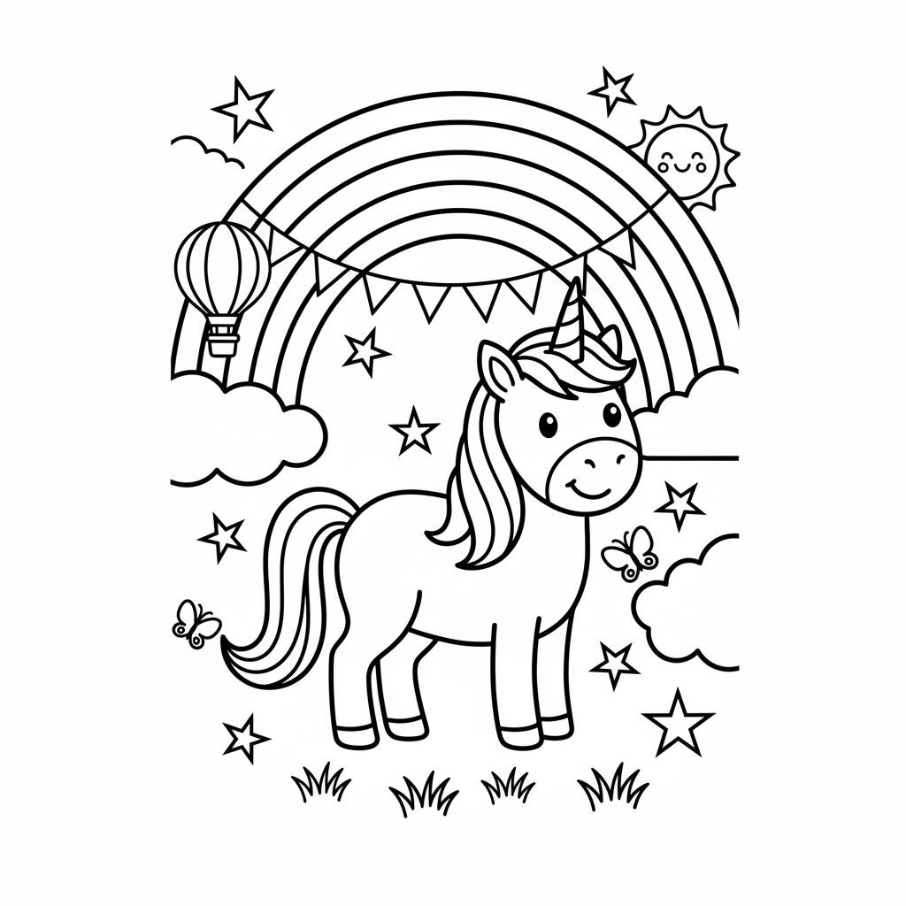 A fun coloring page with a charming unicorn, rainbow and stars, perfect for stimulating children's creativity.