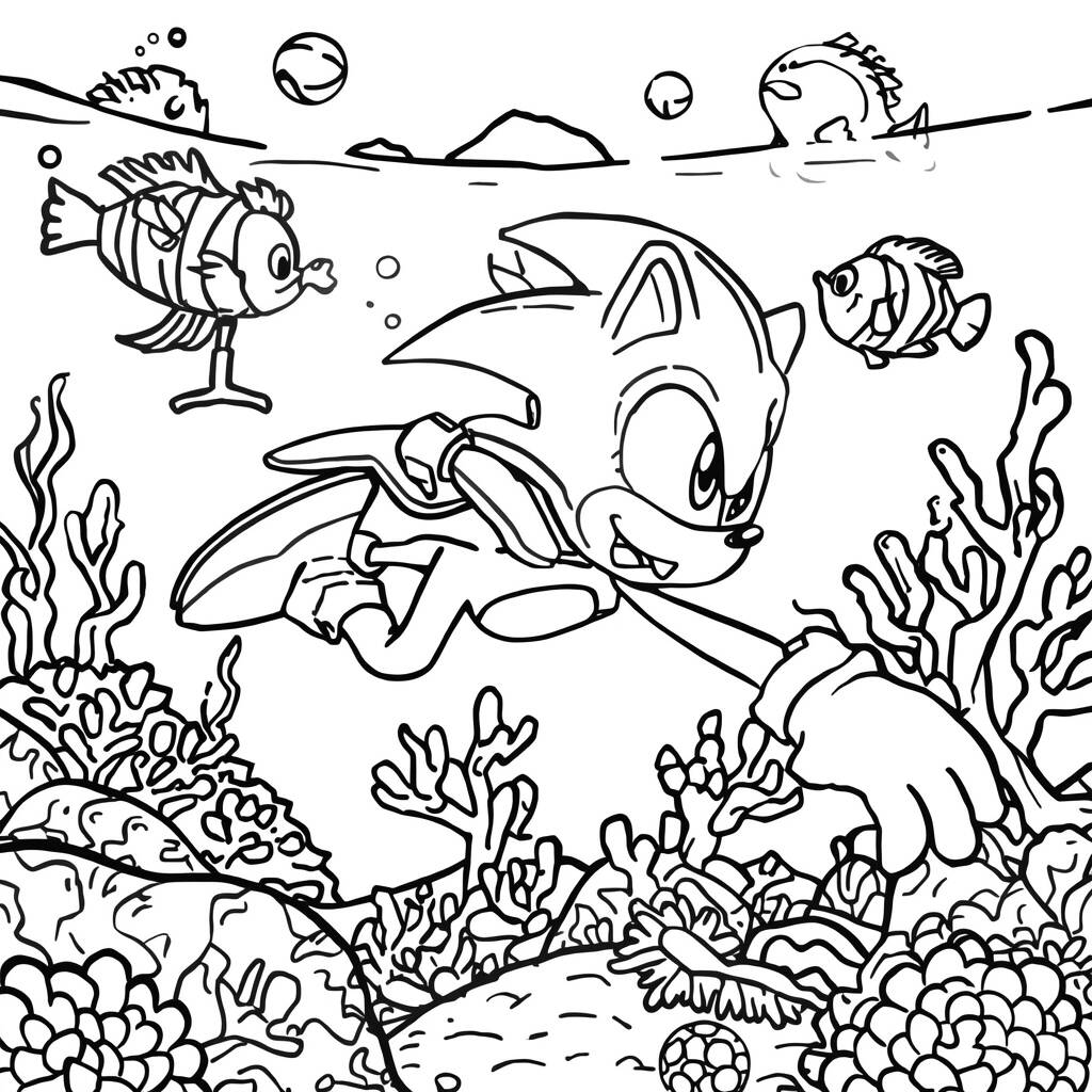 With a smile on his face, Sonic meets new sea friends and faces unexpected challenges, like mischievous crabs and sticky seaweed. Every move is a new opportunity to discover the ocean's secrets while he has fun on his journey. This coloring page invites you to fill this adventure with your own colors, bringing to life the underwater world of Sonic and his friends.