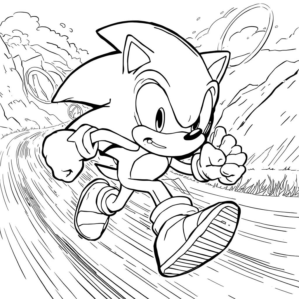 In this exciting Sonic coloring page, we see the fastest blue hedgehog in the world running at high speed, with a determined expression on his face. He is surrounded by golden rings that float around him, while green hills stretch out in the background, creating a vibrant and dynamic setting. The lines of the black and white drawing allow the imagination to come to life with different colors, and every detail invites children to immerse themselves in Sonic's world of adventures.