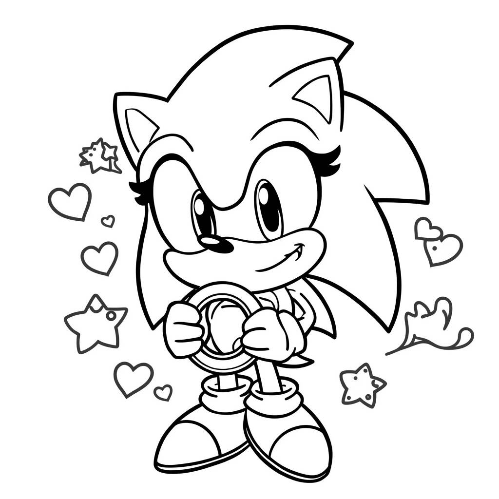 Ao colorir essa página, você pode usar um azul claro e um azul mais escuro para o corpo de Sonic, dando vida ao seu famoso visual. Os anéis podem ser coloridos em amarelo brilhante, enquanto as estrelas e corações podem receber cores pastéis suaves, como rosa e lilás, para criar um contraste delicado. Este desenho não é apenas uma atividade divertida, mas também uma forma de expressar sua criatividade e amor pelo icônico personagem, enquanto você embarca em sua própria jornada de coloração.