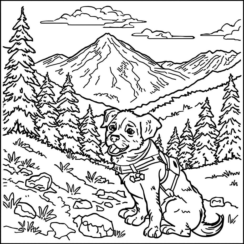 Ao fundo, as montanhas se erguem majestosas, proporcionando um cenário perfeito para a aventura do cachorro. As montanhas podem ser coloridas em tons de cinza ou azul, dependendo da sua preferência, enquanto o céu pode ser um lindo azul claro ou um pôr do sol vibrante. Não se esqueça de adicionar algumas nuvens fofas e pássaros voando para completar a cena! Divirta-se colorindo e deixe sua criatividade fluir.