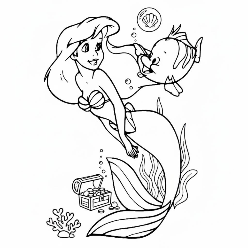 Uma divertida página de colorir da Princesa Ariel, ideal para crianças que adoram aventuras submarinas.