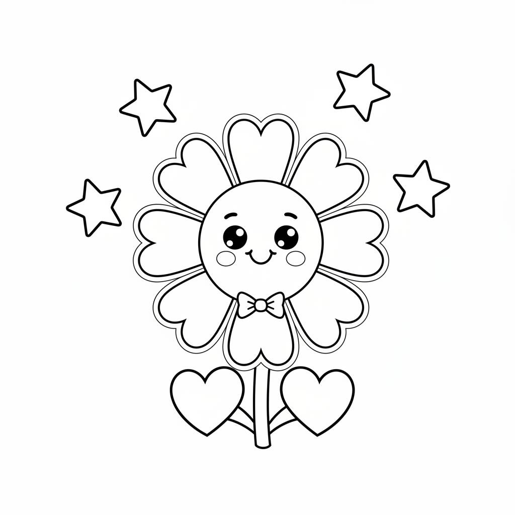 Uma divertida página de colorir com uma flor simpática e elementos encantadores.
