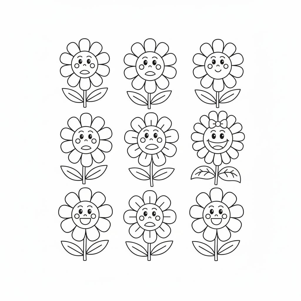 Uma divertida página de colorir com flores expressivas para estimular a criatividade das crianças.