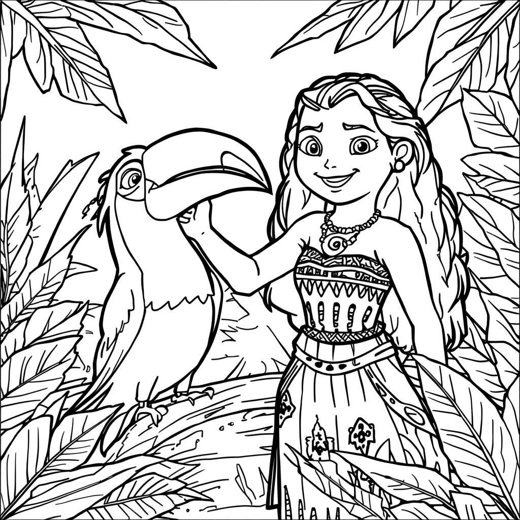 No desenho de Moana com a Teca para colorir, Moana está radiante enquanto brinca com o pássaro colorido, ambos sorrindo sob a sombra das exuberantes folhagens tropicais. A cena captura a alegria da amizade entre Moana e a Teca, que voa ao seu redor, criando um ambiente alegre e vibrante. Para dar vida a essa imagem, use tons quentes de verde para as folhas e cores vivas para a plumagem da Teca, que pode ser colorida em azuis e amarelos, refletindo a beleza da natureza ao redor.