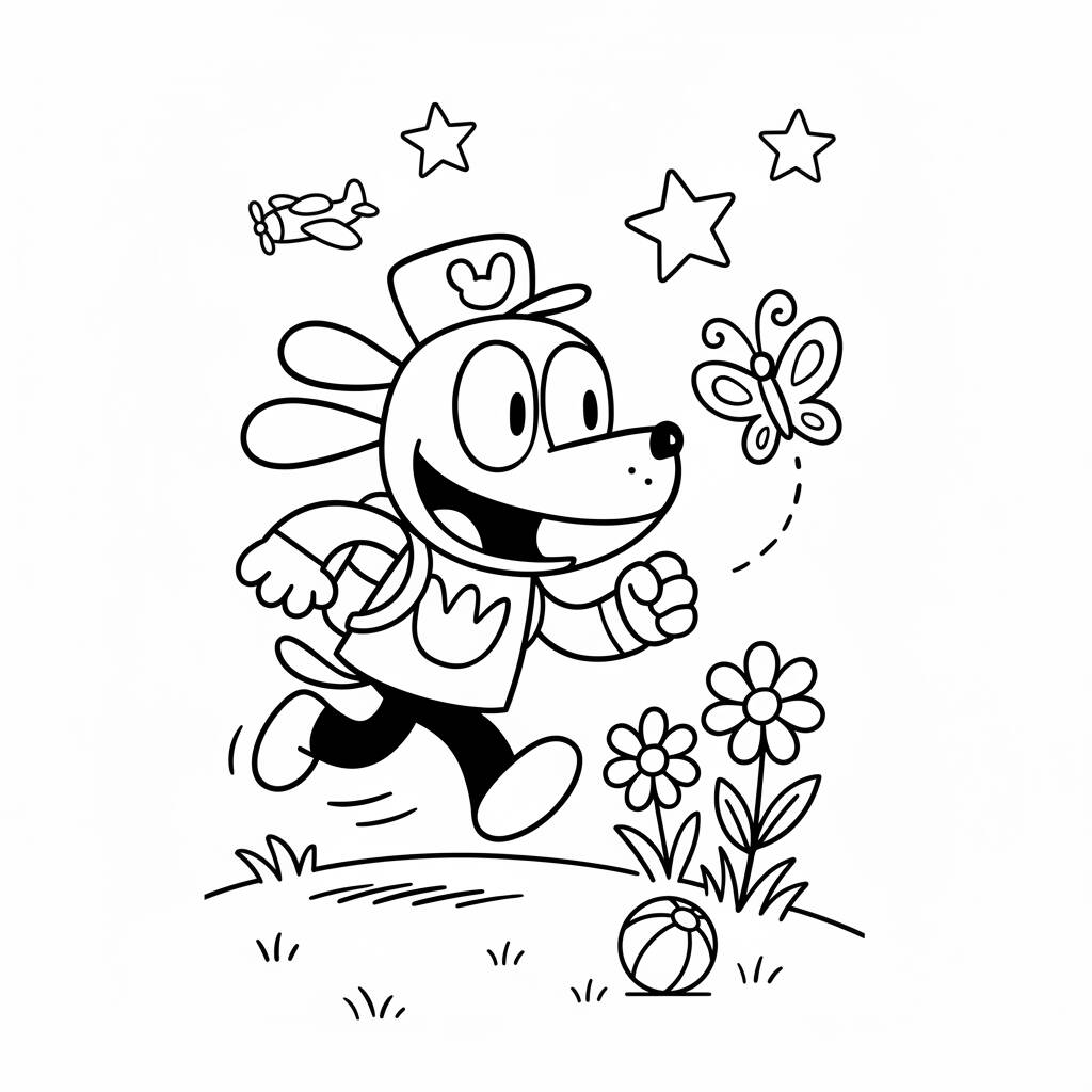 Uma divertida página de colorir do Dog Man correndo em um cenário cheio de flores e estrelas.