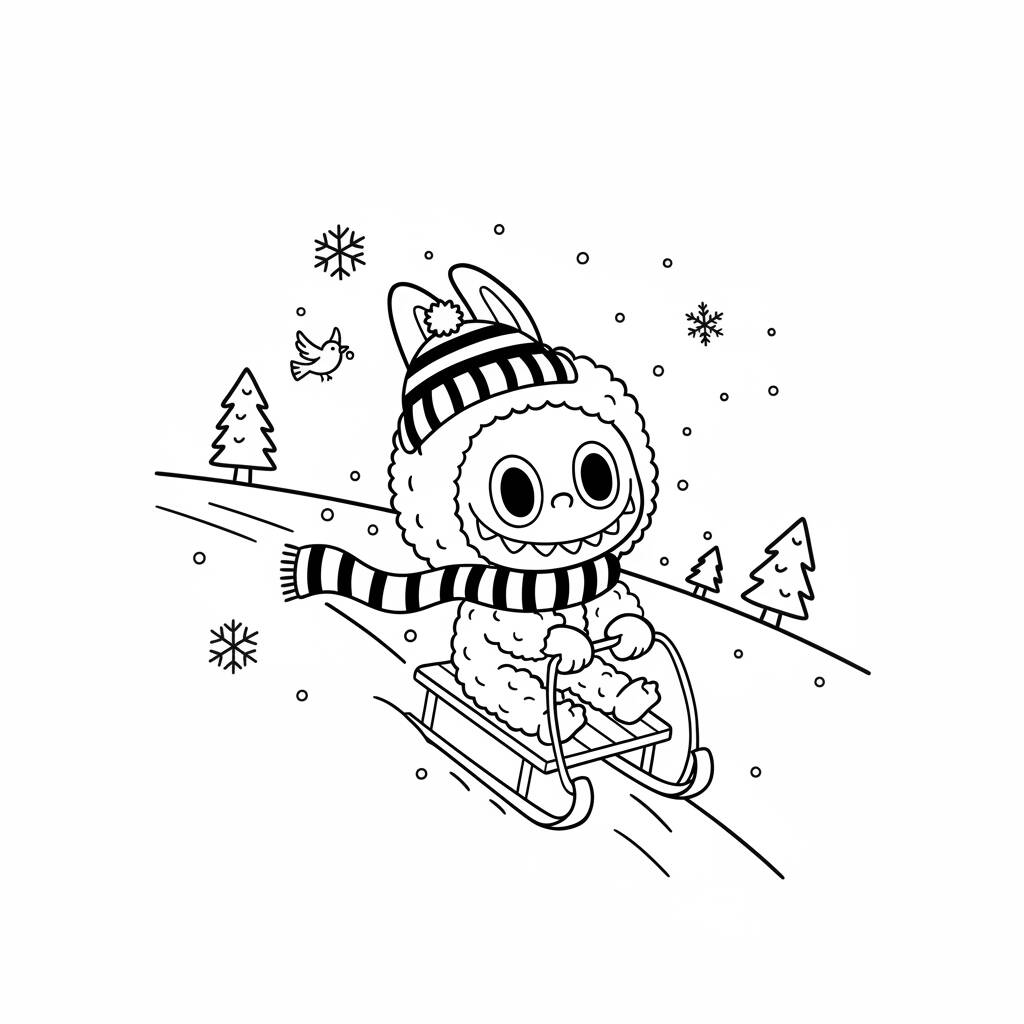 Uma divertida página de colorir do Labubu se divertindo na neve com um trenó.
