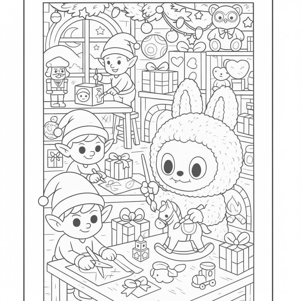 Uma divertida página para colorir do Labubu em um ambiente festivo, perfeita para estimular a criatividade das crianças durante o Natal.
