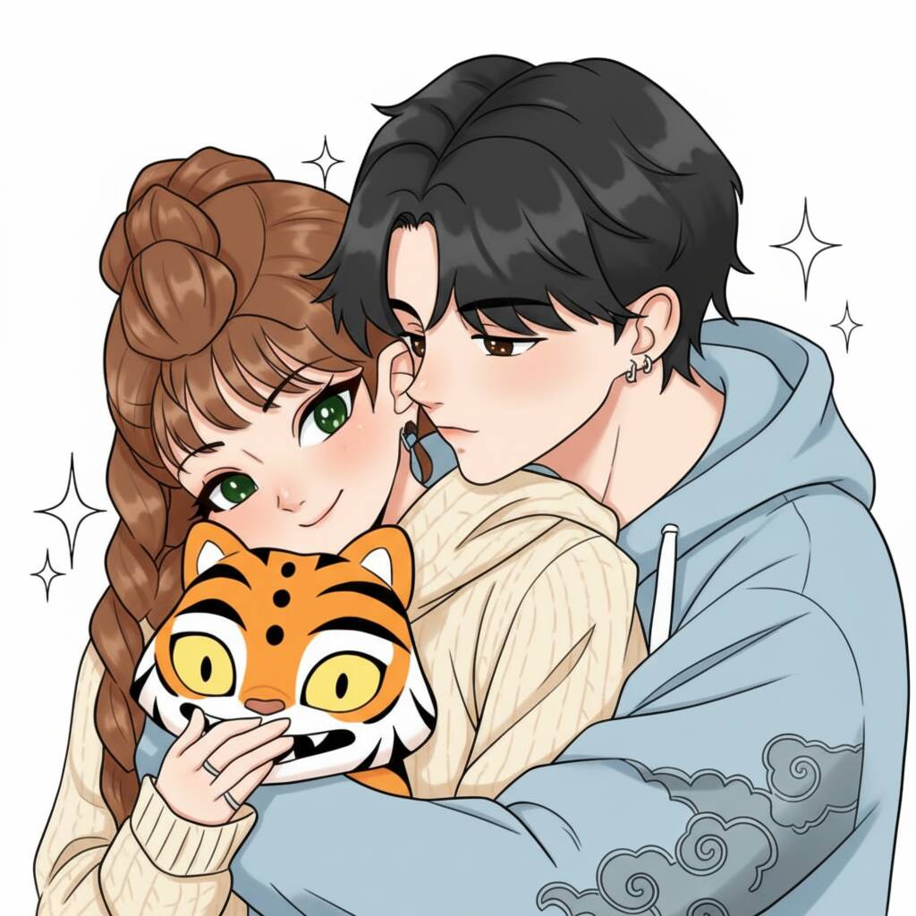Uma encantadora página de colorir com um casal fofo e um tigre de pelúcia, perfeita para estimular a criatividade.