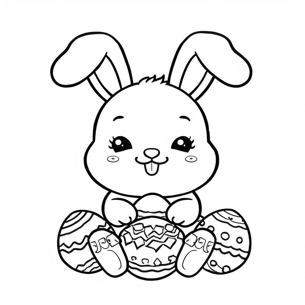 No desenho kawaii de Páscoa, um coelhinho adorável exibe um sorriso contagiante enquanto segura ovos coloridos ao seu redor. Os ovos, decorados com padrões divertidos e vibrantes, refletem a alegria da celebração. O coelho, com suas grandes orelhas e olhos brilhantes, convida todos a se unirem a ele na diversão da Páscoa. As cores pastel predominam, criando uma atmosfera suave e encantadora que captura a essência da temporada.