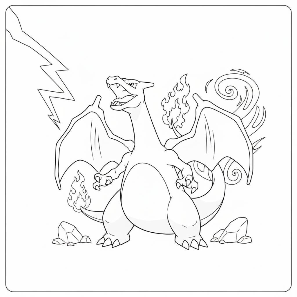 Uma página de colorir do Pokémon Charizard, perfeita para fãs de todas as idades.