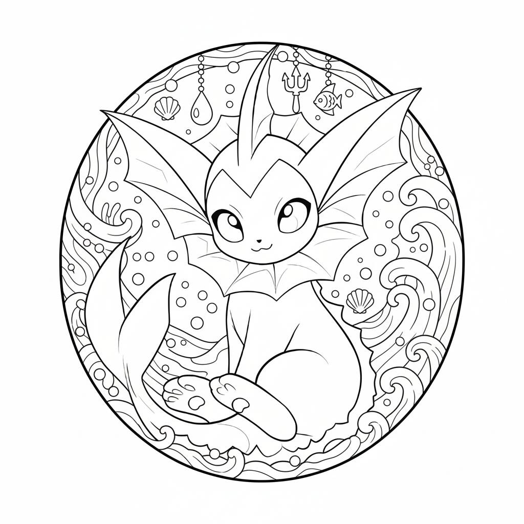 Página de colorir do Pokémon Vaporeon, perfeita para fãs de todas as idades.